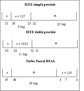 Societatea de calculatoare IEEE a fost cea care s-a preocupat si a elaborat norme de reprezentare a numerelor in virgula flotanta (mobila). Practic toate firmele care fabrica astazi calculatoare si-au insusit aceste norme si le-au implementat. Pe langa standardele IEEE, firma Borland foloseste la implementarea Turbo Pascal alte doua moduri de reprezentare. Aceste moduri de reprezentare sunt redate in figura 1.