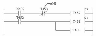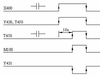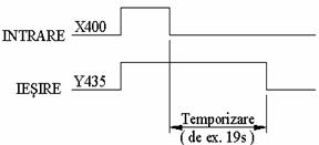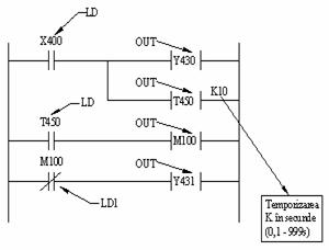 Se considera schema din figura 3.9 cuprinzand un contact de comanda X400 care permite actionarea unor contactoare Y430 si Y431, cu o anumita temporizare (K = 10s), folosind si o memorie intermediara M100.
