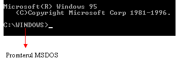 Informatiile oferite de promterul MSDOS. 1. Unitatea de stocare curenta (C:); 2. Calea catre directorul curent (C:WINDOWS) si 3. Directorul curent (WINDOWS).