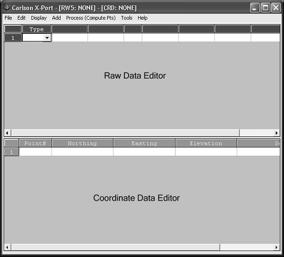 Cand porniti programul este afisat un spatiu gol de editare. Puteti alege mai multe optiuni din meniul File pentru a incepe. Pentru a schimba fisierul de coordonate curente, alegeti comenzile Open sau New Coordinate File. Fiecare linie a tabelului reprezinta o inregistrare. Sunt 15 tipuri de inregistrari. Tipul inregistrarilor este aratat in prima coloana. Tipuri diferite de inregistrari folosesc un numar diferit de coloane. De ori cate ori tipul de date inregistrate se schimba intre linii, la tabel este adaugat un titlu care descrie fiecare coloana de date din liniile care il urmeaza. In acest capitol in sectiunea Formatul fisierelor Raw se afla lista completa a codurilor de titlu si a titlurilor de camp