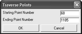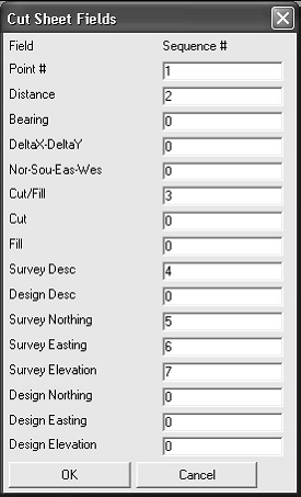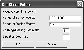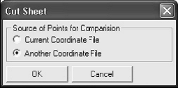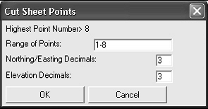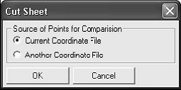 In continuarea o casuta de dialog standard pentru fisiere va permite sa selectati alt fisier CRD pentru comparare. Urmatoare casuta de dialog aratata mai jos va permite sa specificati intervalul de puncte care vor fi comparate, si precizia. In acest exemplu noi comparam toate punctele. Apasati OK pentru a continua. Configurati campurile din urmatoare casuta de dialog si selectati OK pentru a genera raportul cut sheet.