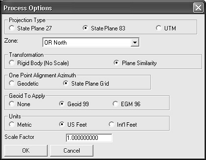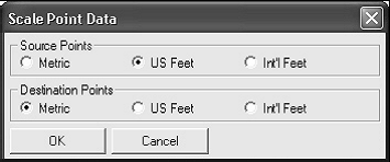 Aceasta comanda va permite sa scalati punctele in fisierul curent de coordonate. Orientarea spre nord, spre est si cota sunt scalate pe baza setarilor pe care le specificati in casuta de dialog de mai jos. Alegeti unitatile pentru punctele sursa si unitatile pentru punctele de destinatie si apasati OK.