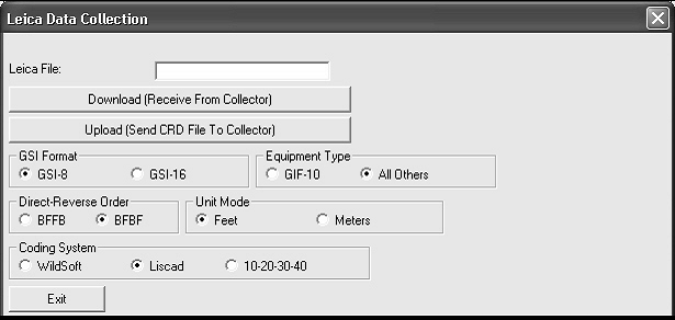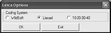 Prezinta casuta de dialog aratata mai jos unde puteti sa selectati sistemul potrivit de codare Leica. Dupa ce apasati OK apare o casuta de dialog standard pentru fisiere. Selectati fisierul .gsi sau .raw pentru import.