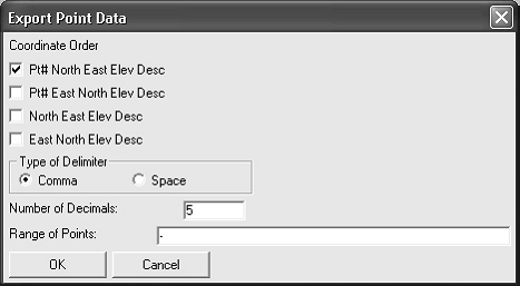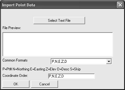 Casuta de dialog Import Point Data permite convertirea datelor punctelor dintr-un fisier text ASCII in fisierul curent de coordonate (.CRD). Fiecare linie a fisierului de text poate contine orice combinatie de numar de punct, orientare spre nord, spre est, cota si descriere. Toata informatia pentru un punct trebuie sa fie pe o linie cu valorile separate prin virgula, spatiu sau alt delimitator.