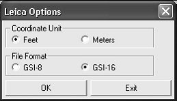 Va permite sa specificati un nume de fisier pentru exportul de la Leica (tipul de fisier .gsi). Apoi va apare casuta de dialog de mai jos unde puteti specifica unitatile de masura si formatul fisierului.