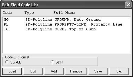 Aceasta comanda va permite sa ediati lista de coduri pentru a fi folosita in SurvCE/g2 sau SDR33. Dialogul principal este aratat mai jos.