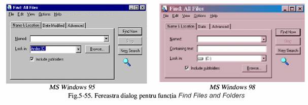 Dupa cum se poate observa in figura 5-55, fereastra dialog dispune de trei pagini. Prima pagina, intitulata Name & Location a fost discutata in lectia 4. Sub MS Windows 98, in plus fata de MS Windows 95, a fost adaugat un nou criteriu de cautare:. in dreptul etichetei Containing text se poate introduce un sir de caractere si localizarea fisierelor va fi efectuata astfel incat sa fie cautate fisierele care includ in continutul lor respectivul text.