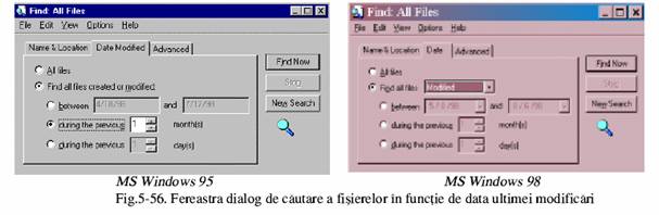 Sub MS Windows 98 aceasta functie poarta denumirea Find all files, urmata de o lista din care se poate selecta tipul datei: Modified - se refera la data ultimei modificari, Created - se refera la data creerii, Last accessed - se refera la data cand a avut loc ultima operatie de accesare a fisierului.