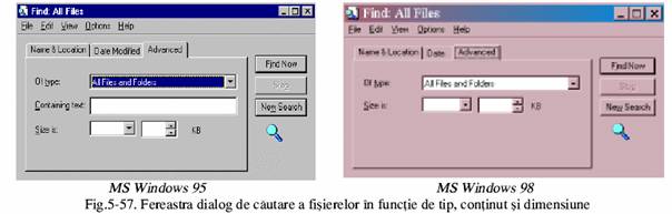 Pagina cu denumirea Advanced permite localizarea fisierelor in functie de tip, continut si dimensiune (vezi figura 5-57).