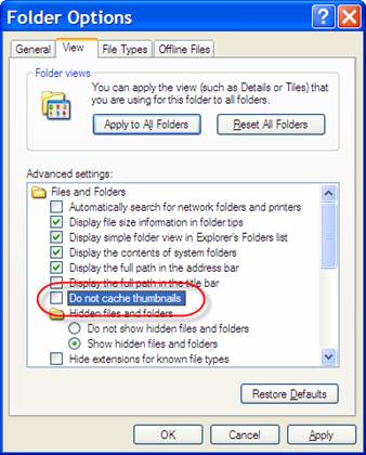iar pentru a pastra copia in thumbnail a imaginilor dintr-un folder va trebui sa aveti dezactivata / debifata optiunea 'Do not cache thumbnails' (valabil pentru Windows XP).