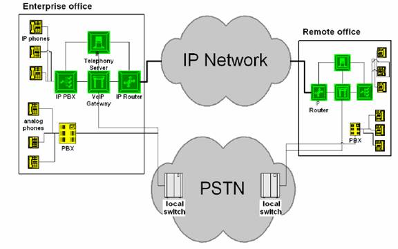 Figure 1O retea VoIP, conectata la o centrala PSTN prin intermediul Gateway-urilor