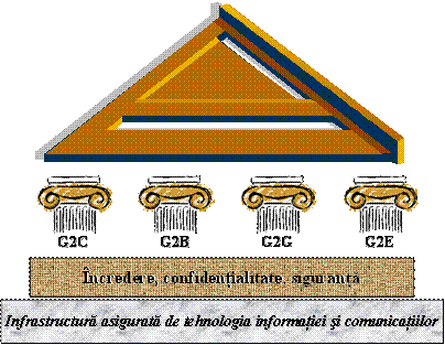Participantii implicati in procesul de guvernare electronica pot fi clasificati in trei categorii: institutiile publice de nivel local si de nivel central, cetatenii si firmele private. In consecinta, guvernarea electronica include trei componente de baza: guvern-cetatean (G2C), guvern-afaceri (G2B) si guvern-guvern (G2G). Ultima componenta include subcomponenta guvern-angajatii administratiei publice (G2E), accentuandu-se astfel rolul functionarilor publici in exercitarea actului de guvernare. Notiunea de guvernare bazata pe noile tehnologii este atribuita ansamblului de sisteme si resurse specifice managementului public care au ca obiectiv optimizarea actului administrativ prin utilizarea noilor tehnologii ale informatiei si comunicatiilor. In literatura de specialitate este deja cunoscuta figura care reprezinta templul guvernarii bazate pe noile tehnologii. Aceasta arata ca noua guvernare trebuie sa-si consolideze sistemul de relatii, de comunicare, de schimb de informatii cu partenerii directi sau impliciti ai procesului de guvernare (figura 5).