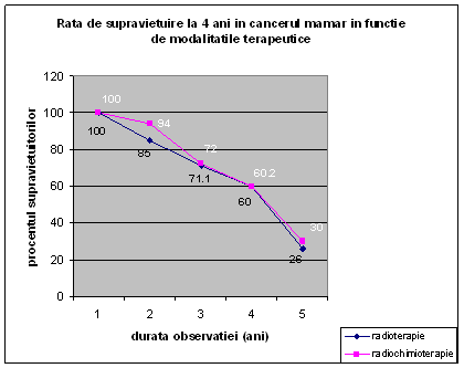 Au fost selectate doua esantioane: primul esantion a primit chimioterapie C.M.F. iar la al doilea polichimioterapia a fost bazata pe adriblastina. In cazul terapiei C.M.F., metoda actuariala indica o supravietuire la 4 ani de 22,5% cu o eroare standard de 0,065 si un interval de confidenta cuprins intre 9,5%-35,5% (Tabel 8.24).