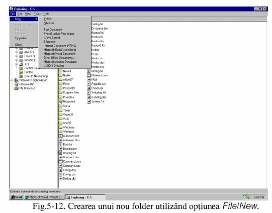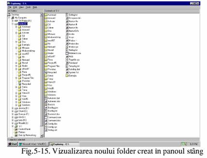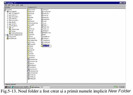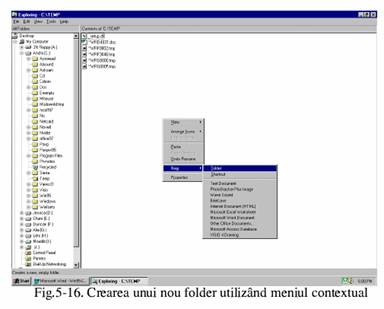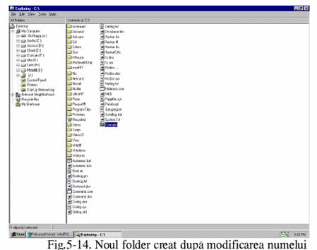 Din lista obiectelor ce pot fi create se selecteaza Folder. Imediat dupa ce a fost selectata optiunea Folder, in panoul din dreapta va fi afisat noul folder, cu numele implicit New Folder (vezi figura 5-13). Se poate observa ca in acest moment poate fi modificata denumirea folderului, deoarece cursorul se afla in interiorul casutei ce contine denumirea folderului. Se introduce de la tastatura numele dorit, in cazul nostru EXEMPLU. Observati ca daca scriem cu litere mari numele, dupa apasarea tastei ENTER denumirea este modificata, astfel incat numai prima litera este litera mare.