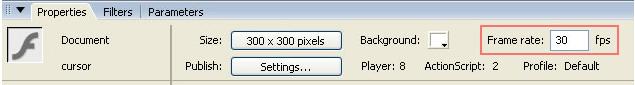 Incepe prin a crea un nou fisier flash. Dimensiunile fisierului si a backgroundului nu sunt importante. Cu toate astea este de recomandat sa schimbi frame rate-ul la 30 sau chiar mai mult pentru a crea un efect mai impresionant. Poti schimba frame rate-ul din Properties Inspector (Window>Properties>Properties sau Ctrl+F3).