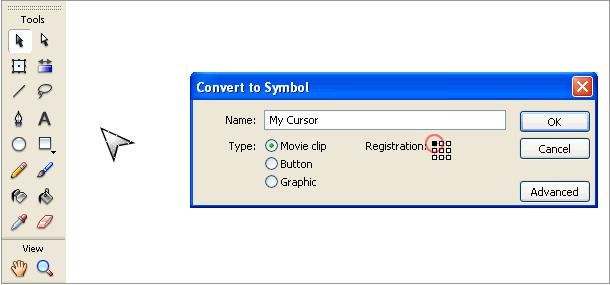 Selecteaza cursorul folosind unealta de selectare sau apasand Ctrl+A pentru a selecta tot ce este pe scena. O data selectat converteste desenul intr-un simbol. Simbolurile poti fi controlate prin ActionScript fata de formele primare si desenele care nu pot fi controlate in acelasi fel. Pentru a converti desenele intr-un simbol, du-te la Modify>Convert to Symbol sau apasa F8 in timp ce obiectul este selectat. In fereastra 'Convert to Symbol' selecteaza 'Movie clip' ca tip de simbol. Asigura-te ca ai selectat coltul superior stanga ca punct de inregistrare. Punctul de inregistrare seteaza centrul Movie Clipului. Apasa "OK".