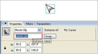 In timp ce Movie Clip-ul nou creat este selectat, acceseaza Properties Inspector si denumeste Movie Clip-ul cu un instance name. Numele de instanta sunt folosite ca referinta pentru a controla Movie Clipul folosint Action Script. Foloseste numele de 'cursor_mc' cand denumesti instanta.