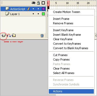 Scena noastra este acum setata. Tot ce trebuie sa facem este sa scriem codul ActionScript pentru a face cursorul sa functioneze. In Layer panel creaza un nou layer apasand pe butonul "Insert Layer". Poti redenumi acest layer cu numele de 'ActionScript'. Right click pe primul frame al layerului si selecteaza "Actions" pentru a accesa panelul ActionScript