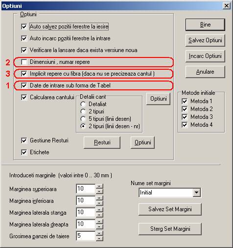 Pentru a seta un mod implicit cu sau fara fibra pentru repere, daca nu precizati date pentru cant, bifati sau debifati optiunea "Implicit repere cu fibra" din fereastra "File->Optiuni", marcata cu 3 in Imaginea .