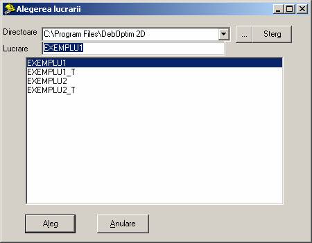 - In campul "Directoare" este afisata calea curenta unde se cauta si se salveaza lucrarile. Daca doriti accesarea unor lucrari din alt director, apasati butonul "." si cautati directorul dorit. Acel director poate fi chiar un director din retea acest fapt va permite sa aveti un singur director cu toate lucrarile chiar daca programul este folosit de pe mai multe calculatoare. Daca deschideti campul combo "Directoare" vor fi afisate toate caile care au fost accesate pentru a deschide lucrari. Aceasta lista este salvata automat de catre program, iar la o noua lansare veti regasi aceste cai in lista. Daca doriti sa stergeti din lista o anumita cale, selectati calea si apasati butonul "Sterg".