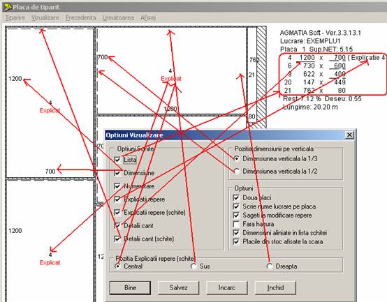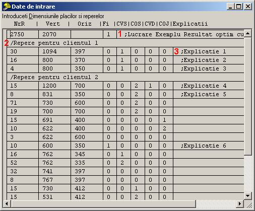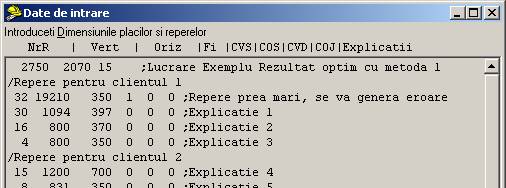 Pentru intreaga lucrare (explicatie marcata cu 1 in Imaginea ), dupa introducerea dimensiunilor placii mari, iar daca este cazul a materialului din care se face debitarea, se pune semnul ";" (punct-virgula) dupa care se scrie textul dorit.