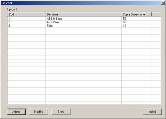 Aici puteti vizualiza lista de canturi deja definite, puteti adauga,modifica si sterge un anumit tip de cant.