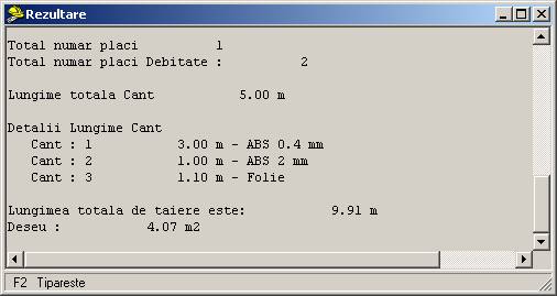 Daca aveti activa aceasta ExtraOptiune si in datele de intrare ati precizat ce laturi trebuie cantuite, in fereastra Rezultate se va afisa metrii liniari necesari cantuirii. La fiecare latura care trebuie cantuita se vor adauga 4 mm ca pierdere.