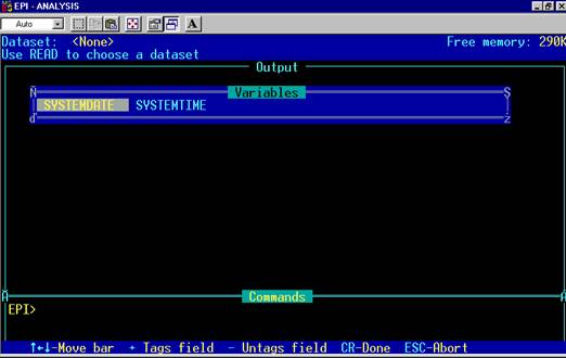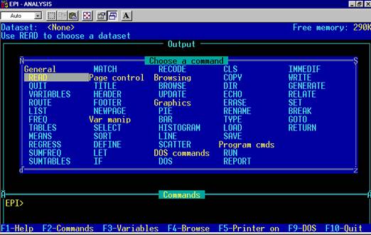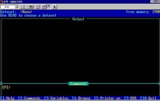 Dataset: precizeaza multimea de date (fisierul sau baza de date) care este deschisa pentru a fi analizata. In mod obligatoriu, pentru desfasurarea unei analize statistice trebuie in prealabil selectat un fisier de date, lucru care se realizeaza folosind comanda READ. Cu aceasta comanda vor fi deschise fisierele de date specifice EPI (fisiere cu extensia .REC), dar in egala masura pot fi deschise si baze de date obisnuite (fisiere cu extensia .DBF). In acest caz, insa, nu se pot realiza decat analize statistice sau listari ale valorilor, datele neputand fi modificate.