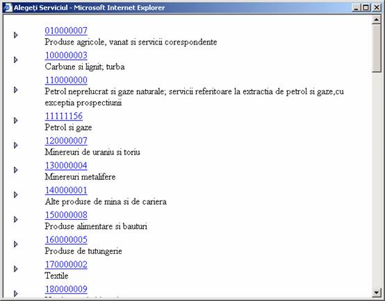 Pentru CPV (Dictionar Comun de Licitatii) puteti fie introduce codurile CPV, fie utiliza butonul etichetat "Alegeti" pentru a deschide un nou formular cu valorile CPV intr-o reprezentare tip Arbore si alegeti de acolo: