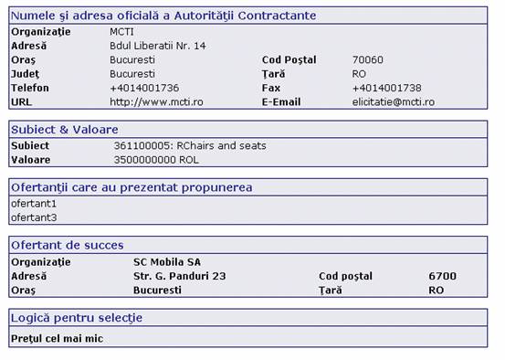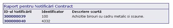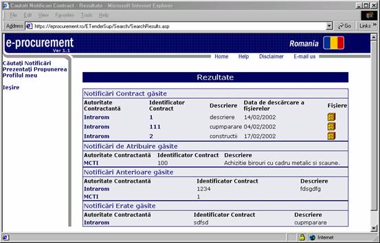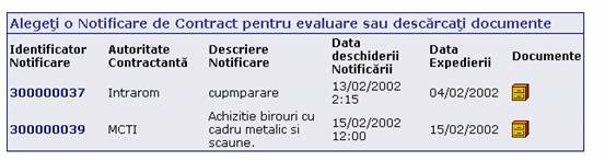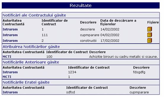 Rezultatele vor fi afisate intr-o noua pagina, fiind divizate in pana la 5 parti: una pentru fiecare tip de notificare. Unele informatii sunt afisate pentru fiecare notificare si, in cazul notificarilor de Contract, documentele insotitoare pot fi disponibile pentru descarcare. Acest lucru este indicat prin butonul galben:
