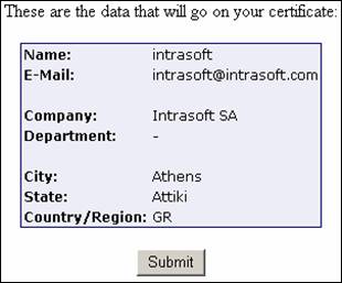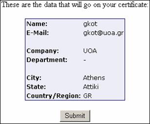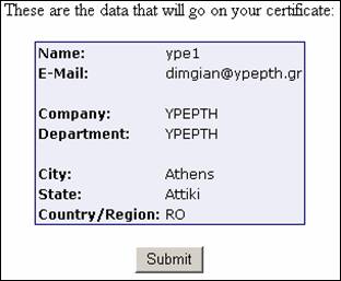 Apasati butonul "Trimite (Submit)" pentru a termina inregistrarea, sau apasati pe butonul "Inapoi (Back)" al browser-ului daca doriti sa modificati anumite informatii. Dupa apasarea butonului "Trimite (Submit)" veti primi mesajul "Cererea dumneavoastra a fost primita. Veti primi un e-mail continand certificarea si parola dumneavoastra de acces imediat ce acestea vor fi generate".
