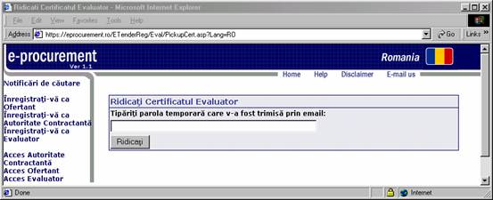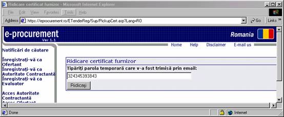Daca ati tastat corect codul temporar vi se va solicita descarcarea Certificatului dumneavoastra prin apasarea unui link etichetat "Instalare Certificat". Dupa accesarea link-ului "Instalare Certificat" asigurati-va de instalarea Certificatului pe PC-ul dumneavoastra (consultati documentatia browser-ului in care Certificatele sunt stocate). Acum puteti accesa link-ul "Conectare Autoritate Contractanta". Pentru informatii suplimentare cititi sectiunea corespunzatoare a acestui manual.