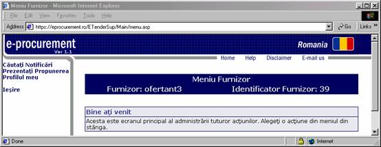 Acesta este primul site pe care un utilizator trebuie sa il acceseze atunci cand doreste sa utilizeze un serviciu oferit de aplicatia E-Procurement. Pe prima pagina trebuie sa selecteze limba dorita: