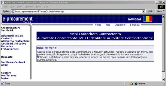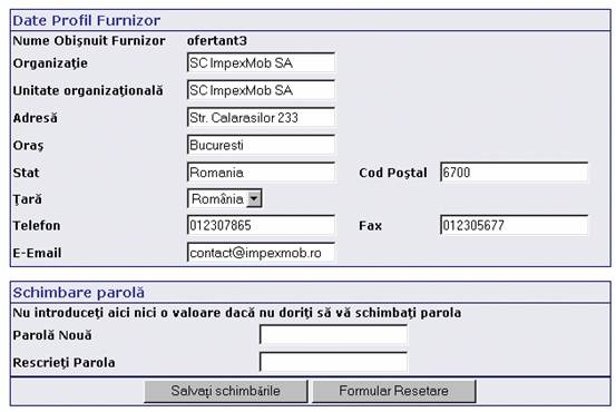 Primul lucru care va trebui sa-l faceti este sa apasati link-ul " Profilul meu (My Profile)" pentru a va modifica parola. Puteti modifica toate datele dumneavoastra, mai putin numele folosit pentru conectare (Login name) si numele Autoritatii Contractante (Contract Authority name). Pentru a va putea modifica parola, introduceti noua parola in ultimele doua campuri, apoi apasati " Salveaza modificarile (Save Changes)".