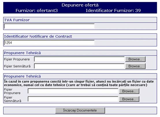 Daca doriti sa incarcati doar fisiere tehnice va trebui sa completati " Fisier Oferta (Proposal File)" sub eticheta " Oferta Tehnica (Technical Proposal)". Daca oferta dumneavoastra include o Economical Proposal (Oferta Economica) separata, atunci va trebui sa completati "Fisier Oferta (Proposal File)" si "Fisier Semnatura" (Signature File) sub eticheta "Oferta Economica" (Economical Proposal). Puteti utiliza butonul "Cautati" (Browse) alaturat fiecarui camp pentru a usura cautarea documentelor ce urmeaza a fi incarcate.
