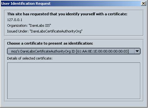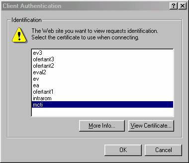 Dupa apasarea link-ului "Conectarea Ofertantului (Tenderer Login)", browser-ul va cere Certificarea pe care doriti sa o folositi pentru schimbul de informatii cu Aplicatia. Fiti atenti sa introduceti Certificarea corecta care a fost generata in timpul procesului de inregistrare. Diversele browsere au modalitati diferite de a cere Certificarea. De exemplu, mai jos sunt prezentate doua imagini, una de la Internet Explorer 5.0 si una de la Mozilla 0.9.4: