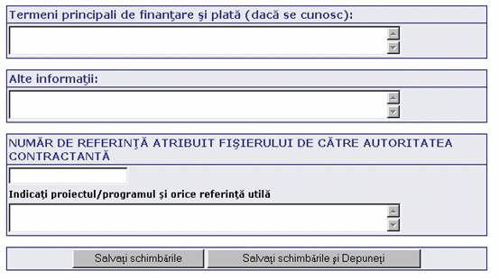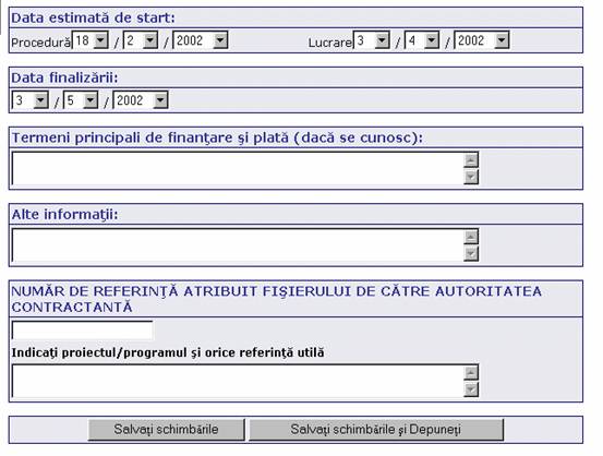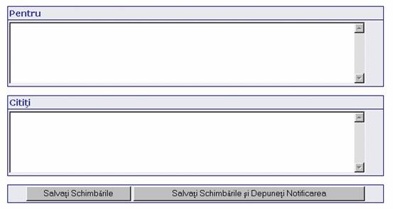 Imaginea de mai sus reprezinta un fragment din formularul de editare al notificarii anterioare. Dupa completarea formularului puteti apasa " Salvati Modificarile (Save Changes)" pentru a salva datele (iar notificarea va fi gasita in lista de notificari in asteptare) sau puteti apasa "Salvati Modificarile si Trimite" (Save Changes and Submit), ceea ce inseamna ca notificarea nu va mai fi disponibila pentru editari viitoare, iar publicul va avea acces la ea.