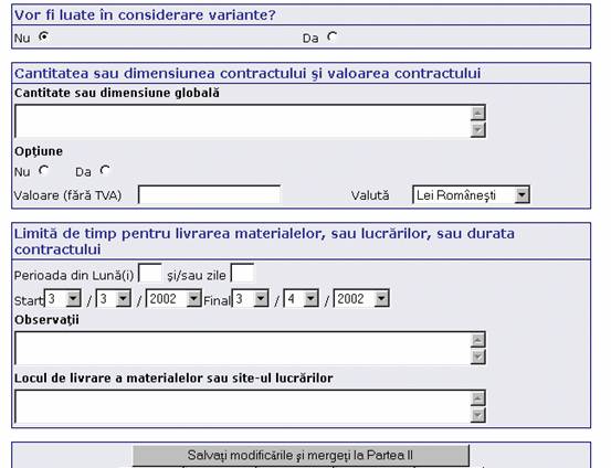 Daca optati pentru crearea unei noi notificari, veti fi transferati in acelasi formular dar avand toate campurile goale. O notificare contractuala se compune din 4 parti. Cand creati o noua Notificare Contractuala veti avea la dispozitie numai optiunea " Salvati Modificarile si treceti la PARTEA a II a (Save Changes and go to PART II). Dupa aceasta prima salvare veti avea optiunea de a merge in oricare din cele 4 parti, validand astfel notificarea, iar la partea a IV a aveti posibilitatea de a trimite notificarea.