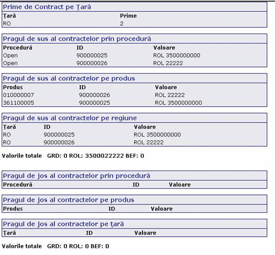 Primul tabel arata numarul total de contracte atribuite tarii ofertantului castigator. Urmatoarele trei tabele arata analiza contractelor atribuite dupa Procedura, Produs si Tara, cu valori deasupra limitelor date. Dupa tabele este afisata o eticheta cu valorile totale.