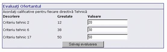 Apasand numele participantului la licitatie, care este un link, sistemul va va transfera catre formularul de editare unde dumneavoastra trebuie sa evaluati oferta economica.