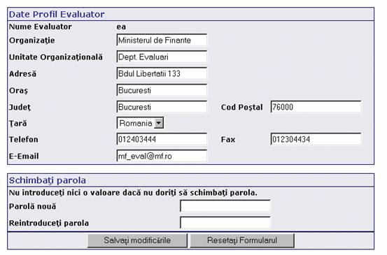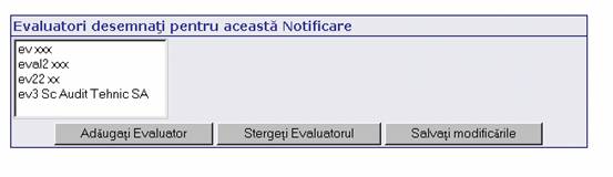 Pentru a sterge un evaluator selectat, selectati numele acestuia din casuta si apasati butonul "Schimbati Evaluator" (Remove Evaluator). Pentru salvarea administratorilor apasati butonul "Salvati Modificarile" (Save Changes).