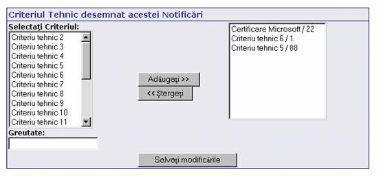 De aici se pot administra Criteriile Tehnice. Accesand o descriere din cadrul de jos se pot completa valorile din cadrul de sus. Acolo se pot edita criteriile si apoi accesati "Actualizare", pentru a le salva, sau "Stergeti", pentru a sterge complet inregistrarea respectiva.