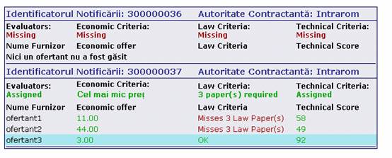 Dupa aceea, urmeaza o lista a ofertantilor cu evaluarile lor, pentru toate criteriile. Se poate observa ca nici un ofertant nu are evaluarile completate: ofertele economice nu sunt completate, Criteriile Legale lipsesc si Criteriile Tehnice nu sunt, inca, evaluate de catre evaluatorii ordinari.