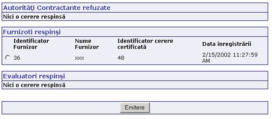Formularul este compus din trei parti: una pentru autoritatea contractanta, una pentru solicitant si una pentru evaluatori. Puteti vizualiza certificatele emise pentru fiecare din aceste categorii. Exista o singura operatie pentru fiecare inregistrare: "Emitere" de certificate.