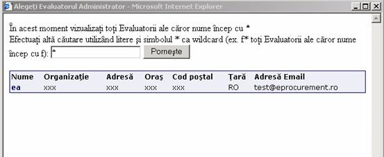 Pentru a reduce lista cu evaluatori se soloseste campul text pentru a scrie unele criterii de cautare, ex.: scrieti "ea*" , apoi apasati butonul "Go". Vor aparea evaluatorii ale caror nume incep cu "ea".