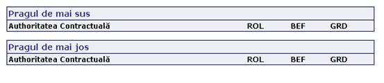 Accesand acest raport sistemul va intreaba despre limitele monedei. Toate limitele trebuie completate. Acest tip de raport este utilizat pentru a imparti Contractele in doua categorii, pe baza valorii atribuite, peste limita sau sub limita.