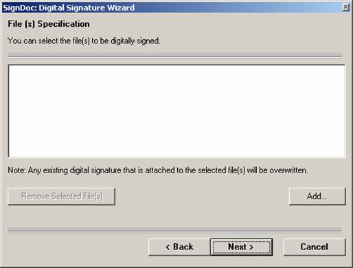 Apasati butonul "Continuati" pentru a trece la al doilea ecran, unde trebuie adaugate fisierele. Apasati butonul "Adaugati" pentru adaugarea fisierelor. Utilizati butoanele "Inapoi", "Continuati" pentru miscarea inainte sau inapoi a indrumatorului. Apasati butonul "Anulati" pentru a parasi SignDoc.