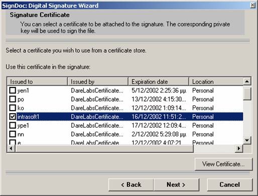 Aici trebuie sa selectati Certificatul pe care doriti sa-l utilizati. Apasati pe casuta mica din stanga unui certificat pentru a-l selecta. Apasati butonul "Vizualizati Certificat" pentru a vizualiza detalii despre certificatele instalate pe computerul dumneavoastra.