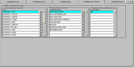 Tipuri contracte speciale posibile - definite anterior in ,Atribute produs SO'- pentru produsele lucrarii. Ex: CONTRACT ADSL, CONTRACT VOCE. |