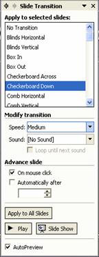 Efectele de animatie se ataseaza prezentarii alegand din meniul Slide Show optiunea Animation Schemes. In partea dreapta a ecranului vor apare mai multe tipuri de animatie care pot fi selectate. Efectul de animatie ales poate fi aplicat diapozitivului curent, mai multor diapozitive selectate sau tuturor diapozitivelor.